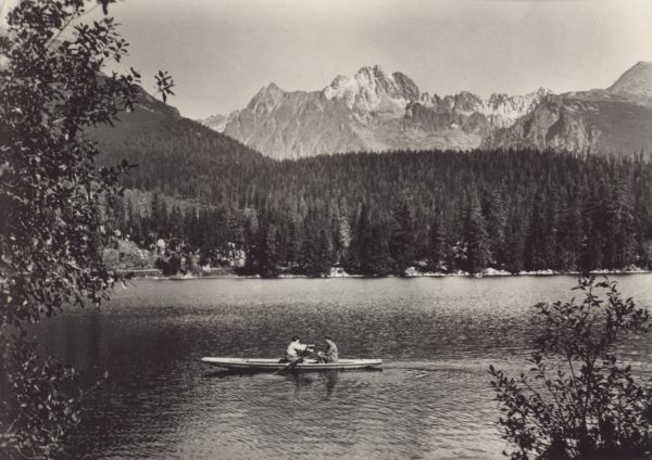 Widok znad Szczyrbskiego Jeziora na panoramę Wysokiej. Po jeziorze pływaj± tury¶ci w łódce. Od lewej: Kopa Poprasdzka, Wysoka, Ganek, Rumanowy Szczyt i Żłobisty Szczyt.