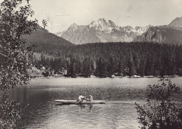 Na pierwszym planie kajak na Szczyrbskim Jeziorze. W tle panorama Wysokiej. Po lewej Popradzka Kopa. Po prawej stronie Ganek, Rumanowy Szczyt i Żłobisty Szczyt.