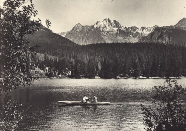 Na pierwszym planie kajak na Szczyrbskim Jeziorze. W tle panorama Wysokiej. Po lewej Popradzka Kopa. Po prawej stronie Ganek, Rumanowy Szczyt i Żłobisty Szczyt.
