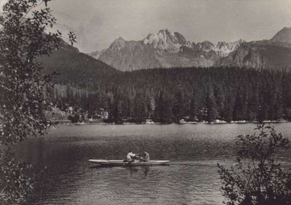 Na pierwszym planie kajak na Szczyrbskim Jeziorze. W tle panorama Wysokiej. Po lewej Popradzka Kopa. Po prawej stronie Ganek, Rumanowy Szczyt i Żłobisty Szczyt.