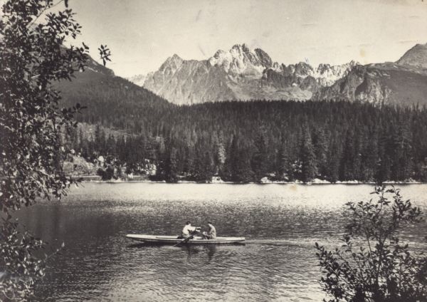 Na pierwszym planie kajak na Szczyrbskim Jeziorze. W tle panorama Wysokiej. Po lewej Popradzka Kopa. Po prawej stronie Ganek, Rumanowy Szczyt i Żłobisty Szczyt.