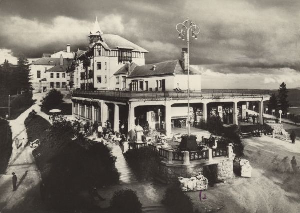 Zabudowania w miejscowości Szczyrbskie Jezioro w zimie. Przed hotelem w ogródku kawiarnianym goście.