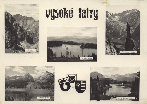 Widok na Nowe Szczyrbskie Jezioro, w tle Wysoka. W górnej części pocztówki napis: vysoké tatry, a w dolnej herby 3 miejscowości.