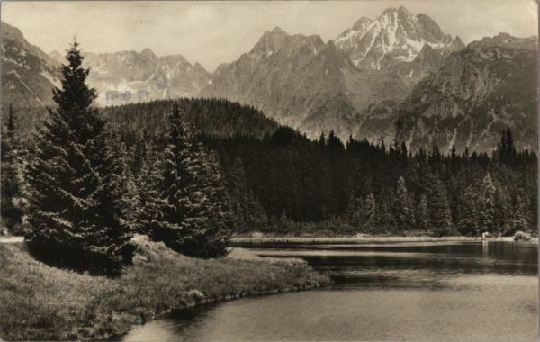 Na pierwszym planie tafla Nowego Szczyrbskiego Jeziora. W tle pejzaż Tatr Wysokich: Wołowy Grzbiet, Kopa Popradzka, Wysoka i Osterwa.
