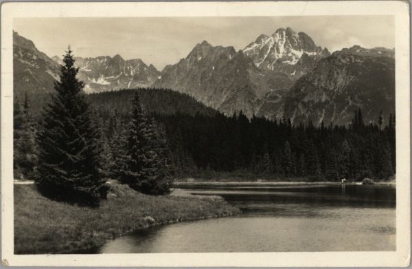 Na pierwszym planie tafla Nowego Szczyrbskiego Jeziora. W tle pejzaż Tatr Wysokich. Wołowy Grzbiet, Kopa Popradzka, Wysoka i Osterwa.