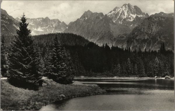 Na pierwszym planie tafla Nowego Szczyrbskiego Jeziora. W tle pejzaż Tatr Wysokich. Wołowy Grzbiet, Kopa Popradzka, Wysoka i Osterwa.