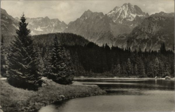 Na pierwszym planie tafla Nowego Szczyrbskiego Jeziora. W tle pejzaż Tatr Wysokich. Wołowy Grzbiet, Kopa Popradzka, Wysoka i Osterwa.