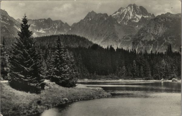 Na pierwszym planie tafla Nowego Szczyrbskiego Jeziora. W tle pejzaż Tatr Wysokich. Wołowy Grzbiet, Kopy, Wysoka i Osterwa.
