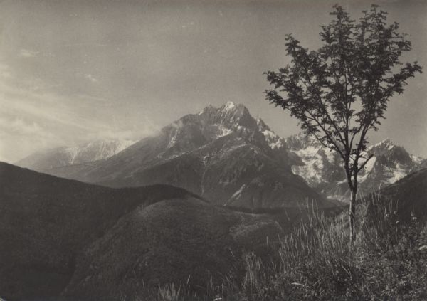 Widok na Łomnicę od wschodniej strony. Na pierwszym planie samotne drzewo.