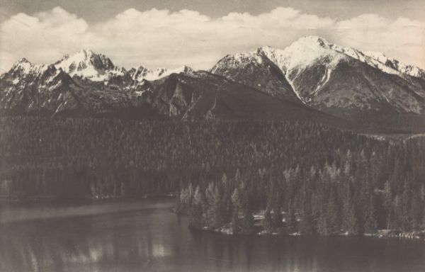 Na pierwszym planie tafla Szczyrbskiego Jeziora. W tle pejzaż Tatr Wysokich. Popradzka Kopa, Wysoka, Osterwa, Tępa i Kończysta.