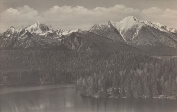 Na pierwszym planie tafla Szczyrbskiego Jeziora. W tle pejzaż Tatr Wysokich. Popradzka Kopa, Wysoka, Osterwa, Tępa i Kończysta.