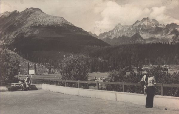 Na pierwszym planie turyści w miejscowości Szczyrbskie Jezioro w Tatrach Wysokich. W tle pejzaż. Skrajna Baszta, Popradzka Kopa i Wysoka.