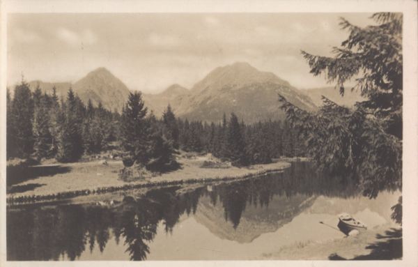 Na pierwszym planie tafla Nowego Szczyrbskiego Jeziora. W prawym dolnym rogu widać zacumowan± łódkę. W tle szczyty Tatr Wysokich: Solisko, Szczyrbski Szczyt i Skrajna Baszta.