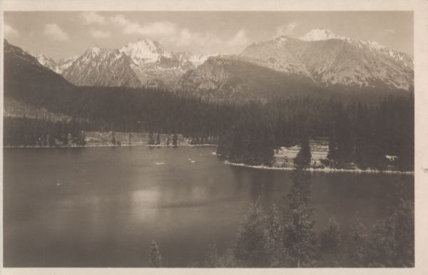 Na pierwszym planie tafla Szczyrbskiego Jeziora. W tle szczyty Tatr Wysokich: Popradzka Kopa, Wysoka, Osterwa, Tępa i Kończysta.