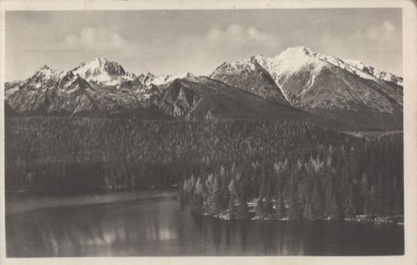 Na pierwszym planie tafla Szczyrbskiego Jeziora. W tle szczyty Tatr Wysokich: Popradzka Kopa, Wysoka, Osterwa, Tępa i Kończysta.