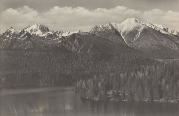 Na pierwszym planie tafla Szczyrbskiego Jeziora. W tle szczyty Tatr Wysokich: Popradzka Kopa, Wysoka, Osterwa, Tępa i Kończysta.