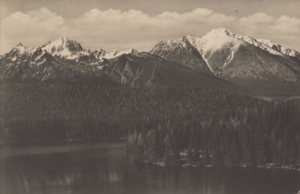 Na pierwszym planie tafla Szczyrbskiego Jeziora. W tle szczyty Tatr Wysokich: Popradzka Kopa, Wysoka, Osterwa, Tępa i Kończysta.