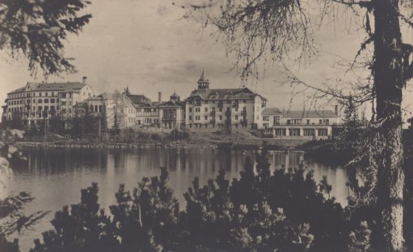 Szczyrbskie Jezioro wraz z zabudowaniami hotelowymi w miejscowości Szczyrbskie Jezioro.