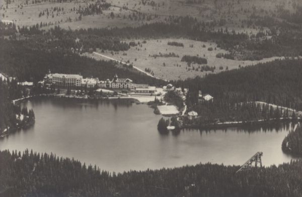 Widok z lotu ptaka na Szczyrbskie Jezioro i zabudowania hotelowe. Po prawej na dole stara skocznia.