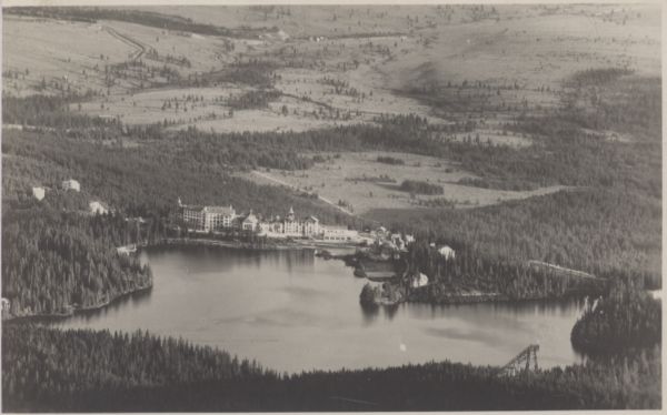 Widok z lotu ptaka na Szczyrbskie Jezioro i zabudowania hotelowe. Po prawej na dole stara skocznia.