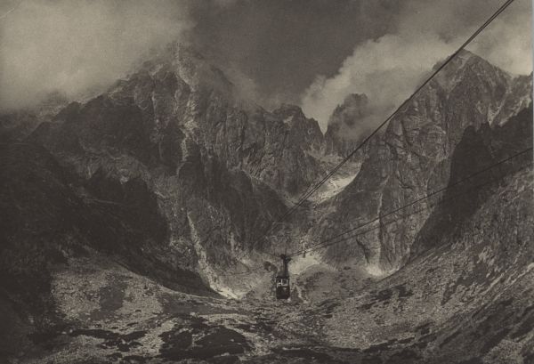 TATRZAŃSKI PARK NARODOWY [Słowacja]. Kolej linowa do Łomnickiego Stawu, w prawo: Zachodni Szczyt Wideł, Przełęcz w Widłach, Wielki Szczyt Wideł i Kieżmarski Szczyt.