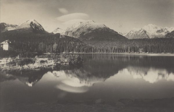 Na pierwszym planie tafla Szczyrbskiego Jeziora w której odbija się górski pejzaż. W tle od lewej Solisko, Skrajna Baszta, Popradzka Kopa i Wysoka.