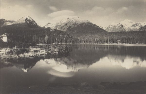 Na pierwszym planie tafla Szczyrbskiego Jeziora w której odbija się górski pejzaż. W tle od lewej Solisko, Skrajna Baszta, Popradzka Kopa i Wysoka.