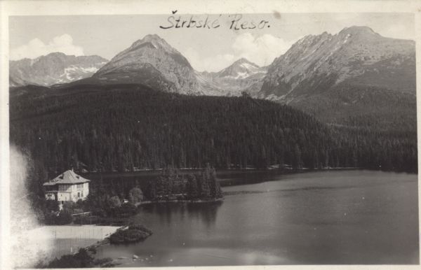 Na pierwszym planie tafla Szczyrbskiego Jeziora. Po lewej stronie willa Marina. W tle pejzaż Tatr Wysokich. Widać Solisko, Szczyrbski Szczyt, Skrajn± Basztę i Szatana. U góry pocztówki odręczny napis: ©trbské Pleso.