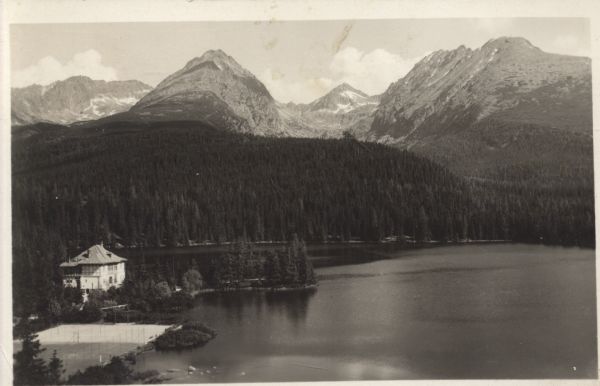 Na pierwszym planie tafla Szczyrbskiego Jeziora. Po lewej stronie Willa Marina. W tle pejzaż Tatr Wysokich. Widać Solisko, Szczyrbski Szczyt, Skrajn± Basztę i Szatana.