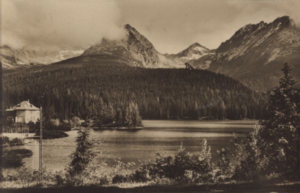 Na pierwszym planie tafla Szczyrbskiego Jeziora. Po lewej stronie willa Marina. W tle pejzaż Tatr Wysokich. Widać Solisko, Szczyrbski Szczyt, Skrajn± Basztę.