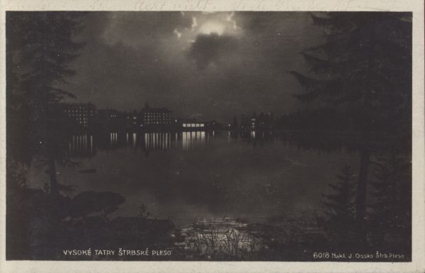 Tafla Szczyrbskiego Jeziora noc± w ¶wietle księżyca. W tle zabudowania hotelu Krywań i Hviezdoslav. Na dole wpisany tytuł i nakładca.