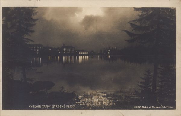 Tafla Szczyrbskiego Jeziora noc± w ¶wietle księżyca. W tle zabudowania hotelu Krywań i Hviezdoslav. Na dole wpisany tytuł i nakładca.