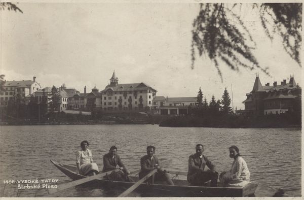 Szczyrbskie Jezioro na pierwszym planie łódź z pięciorgiem turystów. W tle zabudowania hotelu Krywań i Hviezdoslav. Na dole wpisany tytuł.