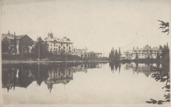 Tafla Szczyrbskiego Jeziora w której odbijaj± się zabudowania hotelowe. Hotele Krywań i Hviezdoslav.