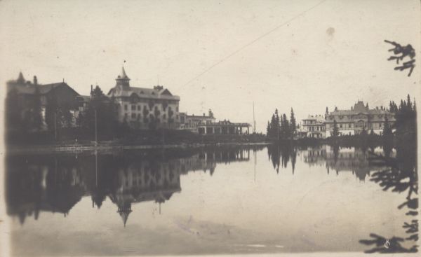 Tafla Szczyrbskiego Jeziora w której odbijają się zabudowania hotelowe. Grand Hotel. (Hotele Krywań i Hviezdoslav).