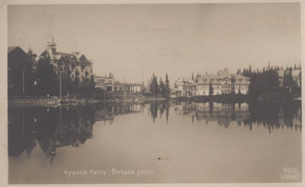 Budynek hotelu Hviezdoslav i Kriváň w miejscowości Szczyrbskie Jezioro. Na pierwszym planie tafla Szczyrbskiego Jeziora. Na dole wpisany tytuł i nazwisko fotografa.