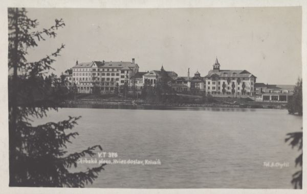 Na pierwszym planie tafla Szczyrbskiego Jeziora. W tle widać budynki hotelowe Hviezdoslav i Kriváň. Na dole wpisany tytuł i nazwisko fotografa.