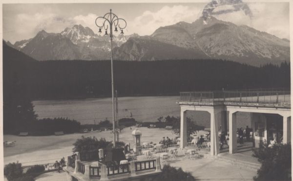 Na pierwszym planie taras, restauracja hotelowa. W głębi tafla Szczyrbskiego Jeziora. W tle pejzaż Tatr Wysokich. Popradzka Kopa, Wysoka, Osterwa, Tępa i Kończysta.