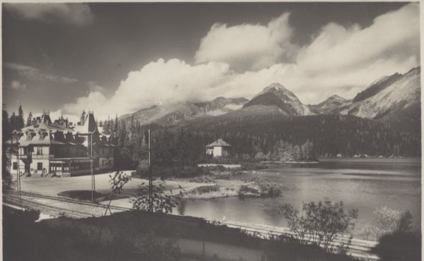 Na pierwszym planie po lewej tory kolei elektrycznej. Dalej zabudowania hotelowe. Po prawej tafla Szczyrbskiego Jeziora. W tle pejzaż Tatr Wysokich. Za chmurami Krywań i Ostra. Widać Solisko i Szczyrbski Szczyt.