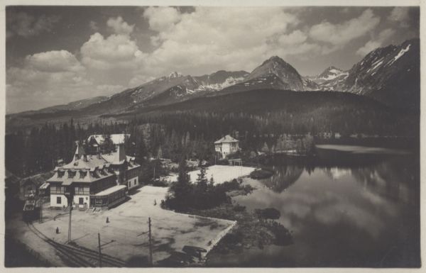 Na pierwszym planie po lewej tory kolei elektrycznej. Dalej zabudowania hotelowe. Po prawej tafla Szczyrbskiego Jeziora. W tle pejzaż Tatr Wysokich. Widoczne Krywań i Ostra, po prawej Solisko, Szczyrbski Szczyt.