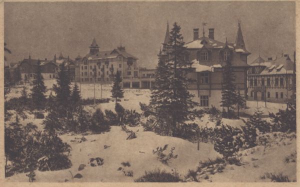 Zabudowania hotelowe w miejscowości Szczyrbskie Jezioro w zimowej scenerii. Na pocztówce znajdują się: Grand Hotel i Dom Jiskry z Brandýsa.