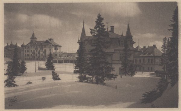 Zabudowania hotelowe w miejscowości Szczyrbskie Jezioro w zimowej scenerii.