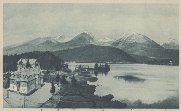 VYSOKÉ TATRY. 24.-25. ©trbské Pleso. Stanica elektr. dráhy, villa Jiskry z Brandęsa, Marina, v pozadí 1. Kriváò (2496), 2. Krátká (2370), 3. Solisko (2414), 4. ©trbskę čtít (2385), 5. Patria (2205), 6. Vel. Vysoká (2565).