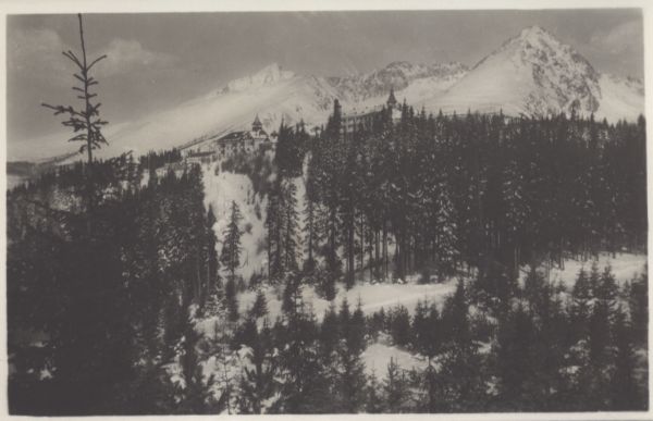 Pejzaż Tatr Wysokich. W głębi widać zabudowania Szczyrbskiego Jeziora. W tle zimowa panorama. Widać Krywań i Solisko.