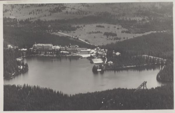 Widok na Szczyrbskie Jezioro ze szczytu Skrajnej Baszty. W głębi widać zabudowania hotelowe Szczyrbskiego Jeziora. (Hotele: Krywań, Hviezdoslav, willa Marina, Dom Jiskry z Brandýsa. Na pierwszym planie po prawej stronie widać starą skocznię narciarską.