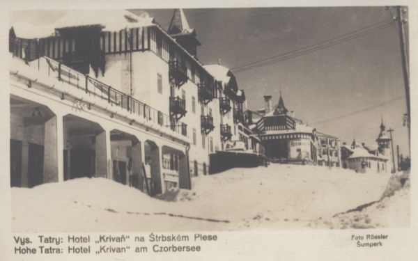 Widok na budynek Hotelu Krywań w Szczyrbskim Jeziorze w zimowej scenerii. Pod zdjęciem wpisany tytuł, również w języku niemieckim i nazwisko fotografa.