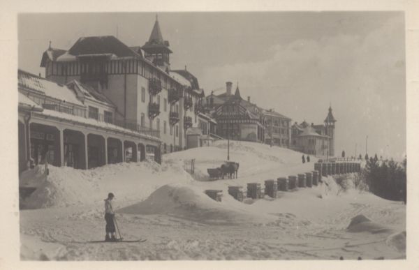 Widok na zabudowę Szczyrbskiego Jeziora w zimowej scenerii. Na pierwszym planie narciarz.