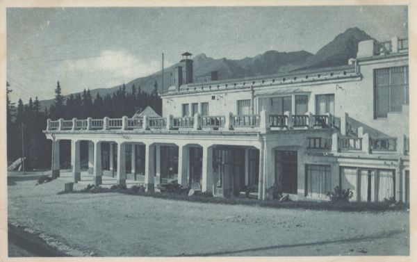Tatry Wysokie. Szczyrbskie Jezioro: Kawiarnia, w tle i Krywań i ®elízko. (Pomyłka w opisie zamiast ®elízko powinno być Solisko.)