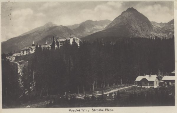 Widok na zabudowania w osadzie Szczyrbskie Jezioro. W tle Krywań, Ostra i Solisko.