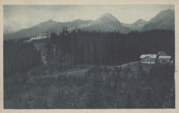 Widok na zabudowania w osadzie Szczyrbskie Jezioro. W tle Krywań, Ostra, Szczyrbskie Solisko i Szczyrbski Szczyt.
